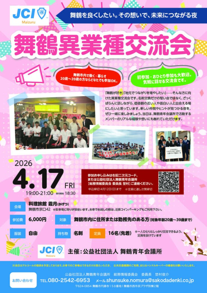 4月異業種交流会を開催いたします! 『舞鶴を良くしたい。その想いで、未来につながる夜』をテーマに、『舞鶴が好き』、『地元でつながりを増やしたい』…そんな方に向けた異業種交流会です。名刺交換だけの堅い会ではなく、ざっくばらんに話しながら、価値... -