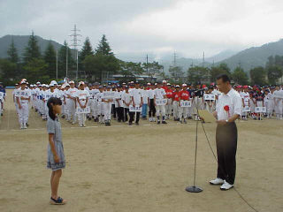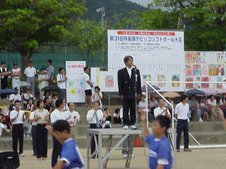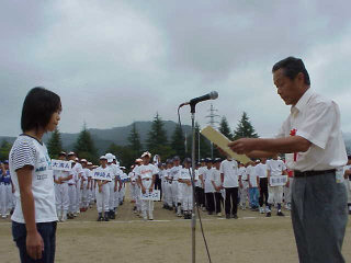 | また、開会式に於いて、この大会と共に開催しておりますチビッコソフトボール大会ポスター展の表彰状授与式を行い、今年度より、舞鶴市・舞鶴市教育委員会 両様のご厚意により市長賞・教育長賞の授与並びに、チアリーディングクラブによる選手激励も行われました。 |