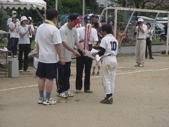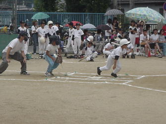 1週間の順延や当日も雷雨により一時中断を余儀なくされるなど、今年は雨にたたられた大会となりましたが、大会関係者の皆さんのご協力によって、何とか校区大会を7/20に終えることができました。 特に、雷雨の後、役員の皆さんによる懸命の水取り作業のおかげで実施することができた決勝戦では、万全とはいえないグラウンドコンディションの中、果敢にダイビングキャッチやスライディングを試み、優勝を目指して一生懸命プレーする選手達の姿が見受けられました。 約2ヶ月間に及ぶ練習を積んできたことに対する万感の思いと相まって、試合後は勝って泣く子、負けて泣く子、まさに悲喜こもごもで、そんな涙する子どもたちの姿に思わず熱いものがこみ上げてきました。 少子化の影響を受け、今年はチーム編成の地区割を変更せざるをえなくなるなど、今後の大会運営が懸念されますが、やりたいと願う子どもたちがいる限り、何とか頑張って続けていきたいなぁとあらためて思った次第です。