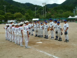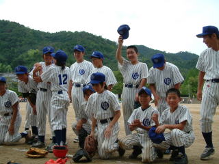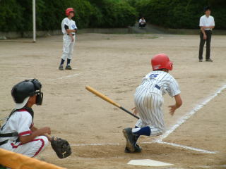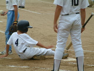 | チーム一つになって円陣を組み、勝利に向かって力をあわせる。子供同士のつながりが生まれます。 | 幾度となく、ホームベースに滑り込む子供達の姿が。勝ちたいという気持ちが前面にでます。 |