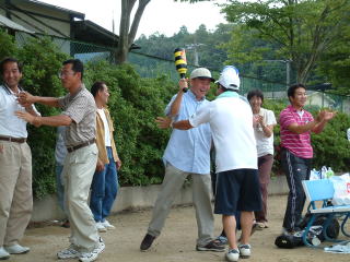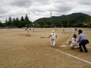 | 校区大会前から暑い中練習を重ね、ヒットが打てたこの瞬間。練習の成果が出ました。 | 白球をみんなで追う姿。一つの目標に向かって地域のみんなで力をあわせることが本当に大切です。 |