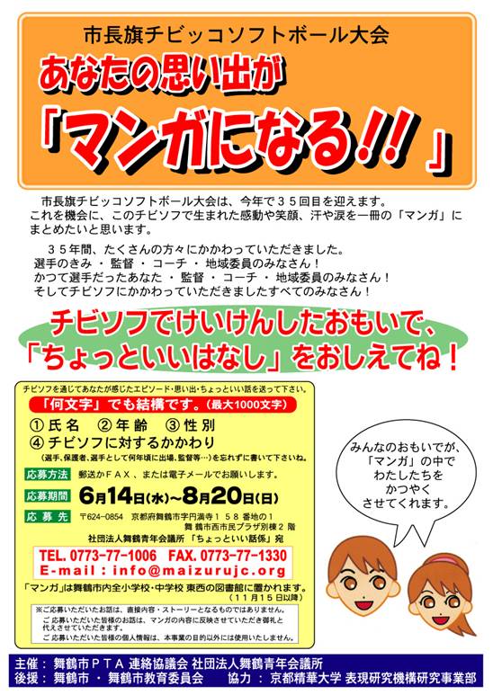 過去34年に渡り舞鶴市の夏のチビッコ甲子園として開催されてきました「市長旗チビッコソフトボール大会」。この大会で生まれた感動や笑顔、汗や涙を一冊の「マンガ」にまとめたいと考えています。多くの皆様の経験・思い出のエピソードをどしどしご応募ください。あなたの思い出がマンガになります。