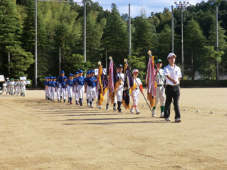 続いて、昨年度優勝チームのキャプテンが 優勝旗を持っての入場 |
