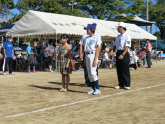 | Cゾーンの始球式は舞鶴市PTA連絡協議会 網干会長 |